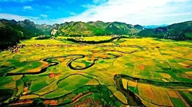 平塘县的油菜花种在六硐河边的大坝上,到了春天,大坝就变成了黄绿色的花田。蜿蜒盘旋的六硐河在花田里贯穿,如果能泛舟河上,定能更好地感受油菜花的美好。