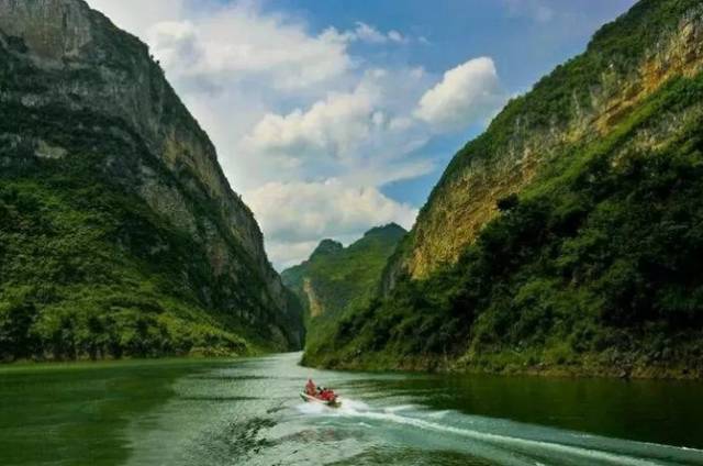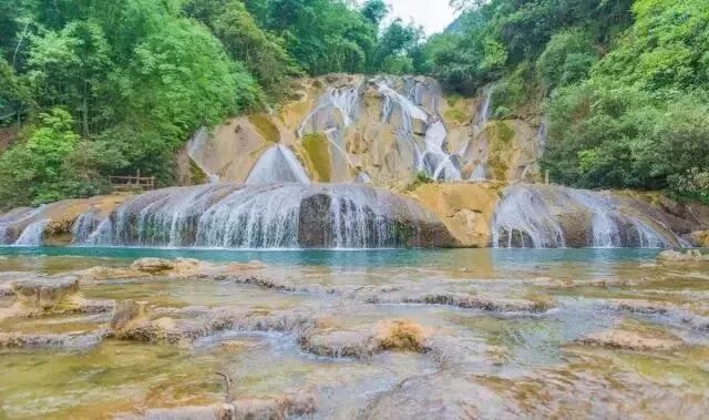 南江大峡谷两岸是典型的喀斯特地貌,山崖夹着清澈的河流,姿态万千的瀑布群从山崖跌落,风光旖旎。