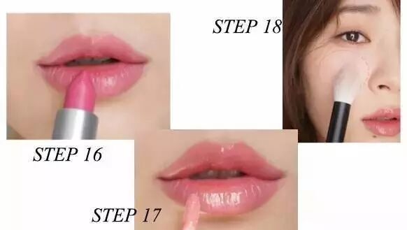 STEP16:用粉色唇膏重点涂嘴唇内部,唇线边缘轻轻擦一层即可,保留唇线颜色,可使唇部更加粉嫩饱满