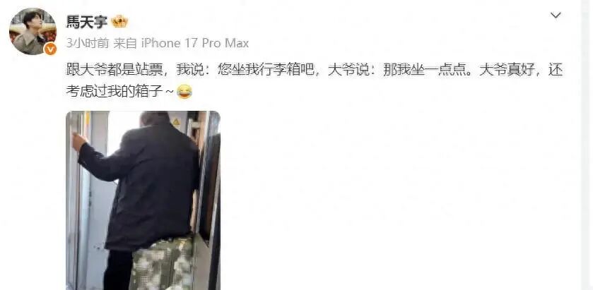 3月9日,马天宇发了一段日常,他在高铁上,买了站票,身边也有位买站票的大爷,结果呢,他把自己的行李箱让出来,让大爷坐一会儿,画面不大,气氛很暖