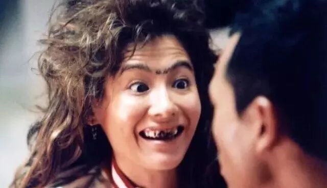 同样是星女郎,在星爷《少林足球》中的阿梅扮演者赵薇,油腻腻的头发,满脸的暗疮和脓包和忧郁的小眼神儿,曾经鲜活古灵精怪的小燕子变这个样子了~