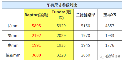 Raptor的尺寸究竟是多少呢?如果只说它的尺寸是5895×2192×1991mm,但这样还是有些抽象,所以我们不妨采用比较的方法。先看看我们经常称之为霸气的宝马X5吧,事实证明它们的差距真的很大,不是一圈两圈的大,而兰德酷路泽甚至同为美式皮卡的坦途也败下阵来,有这两个有实力的对手验身,足以证明其尺寸的强大。