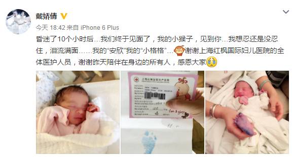 4月4日下午,戴娇倩晒出刚刚出生的女儿的照片,并写道:昏迷了10个小时后…我们终于见面了,我的小猴子,见到你…我想忍还是没忍住,泪流满面……我的"安欣"我的"小格格"…谢谢上海红枫国际妇儿医院的全体医护人员,谢谢昨天陪伴在身边的所有人,感恩大家。