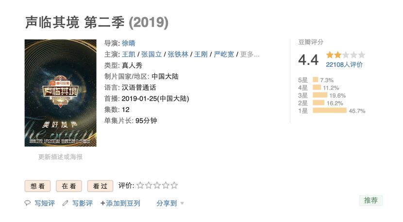 当来到第五期,即便端出了被网友称赞为“两季以来最精彩和华丽的大秀”的“淑女的腔调”“这道菜”,这一季的《声临其境》在口碑表现上依然没能挽尊,从具有重要参考价值的豆瓣评分便可窥得一二:依然停留在尴尬的4.4分上,45%的网友“怒打”一星。