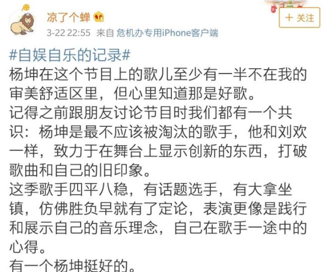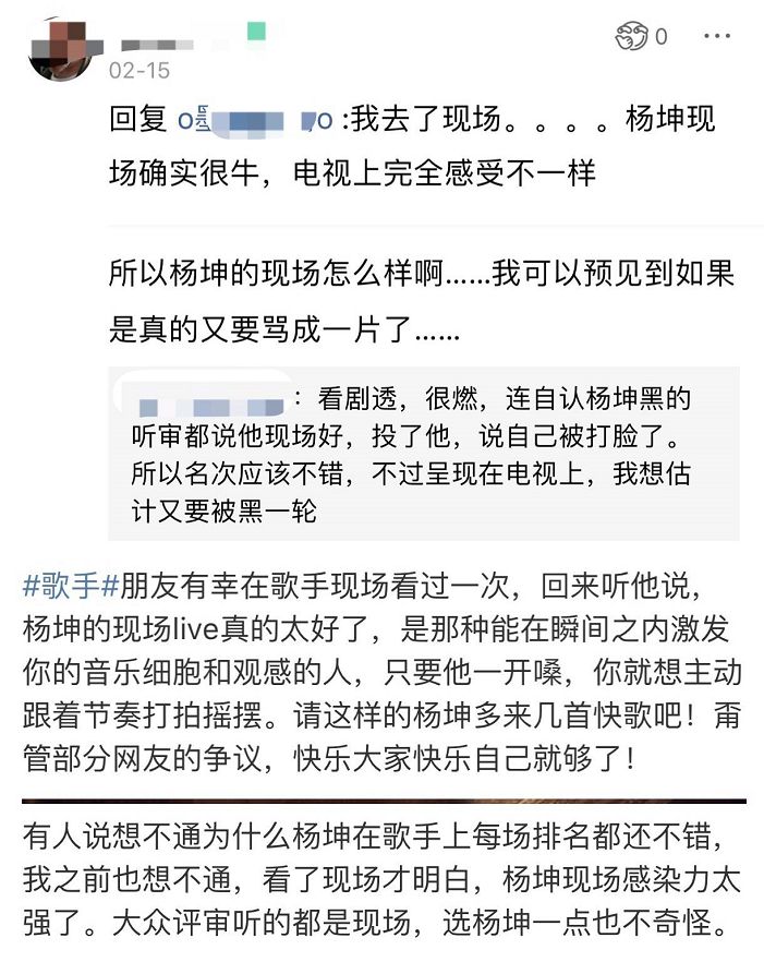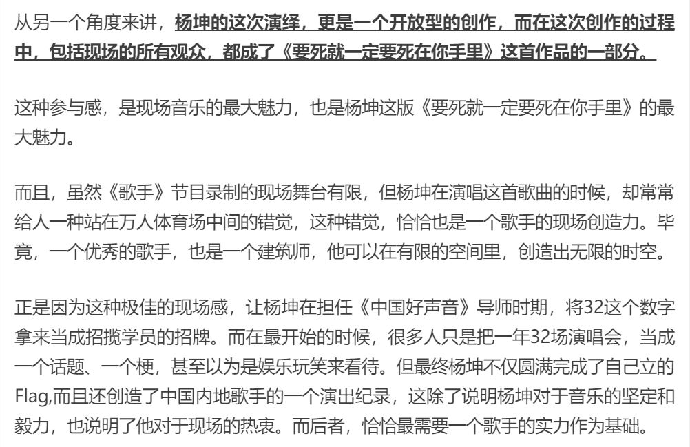 说到杨坤的演唱功底和现场Live,莫过于专业乐评人和大众听审最有发言权。每一期的《歌手》repo,都是一次大型真香现场,杨坤的表现让许多现场听众表示震撼,甚至放下偏见,主动改观;