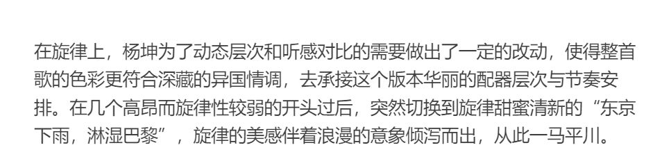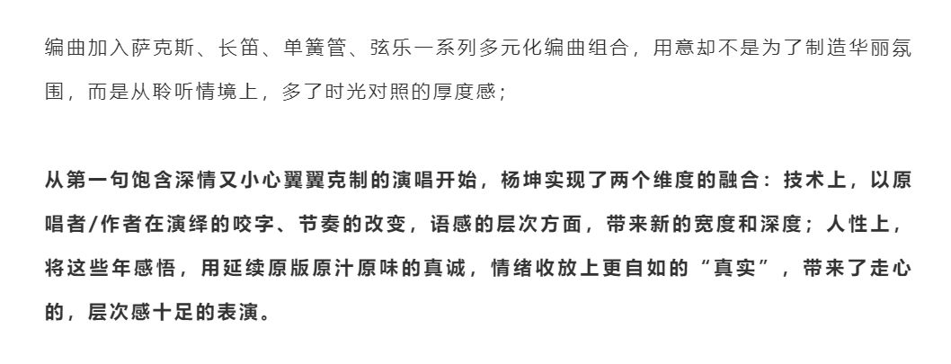 乐评人流水纪更是夸赞杨坤的演唱实现了技术和人性两个维度的完美融合,层次感十足。