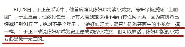 但彼时正是于妈最得意的时候,不仅放豪言表示“陈妍希就是我心目中的小龙女”,更称“定妆照不及正片的万分之一!”。