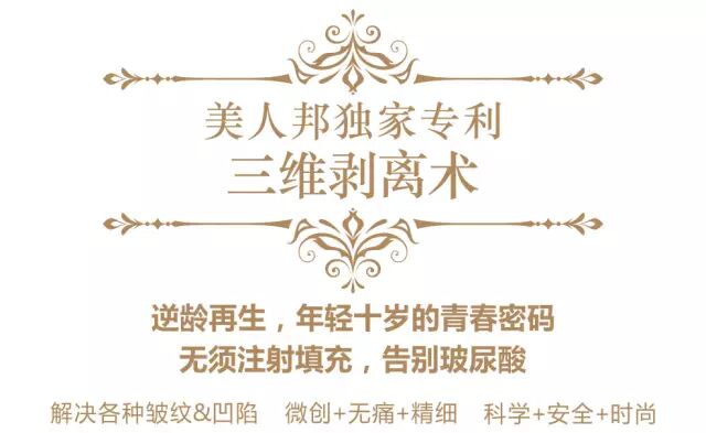 当你老去,不再皮肤细腻,光彩照人,满脸皱纹,一头白发,你会不会想起年轻的自己呢?然则,人总会老,逃避、漠然终是无用,不过聪明的女人总能找到属于自己 的“不老青春的秘籍”!衰老虽然无法抗拒,但是美人邦旗下的专利抗衰技术——三维剥离术却可以延缓它的脚步,挽回你的青春……
