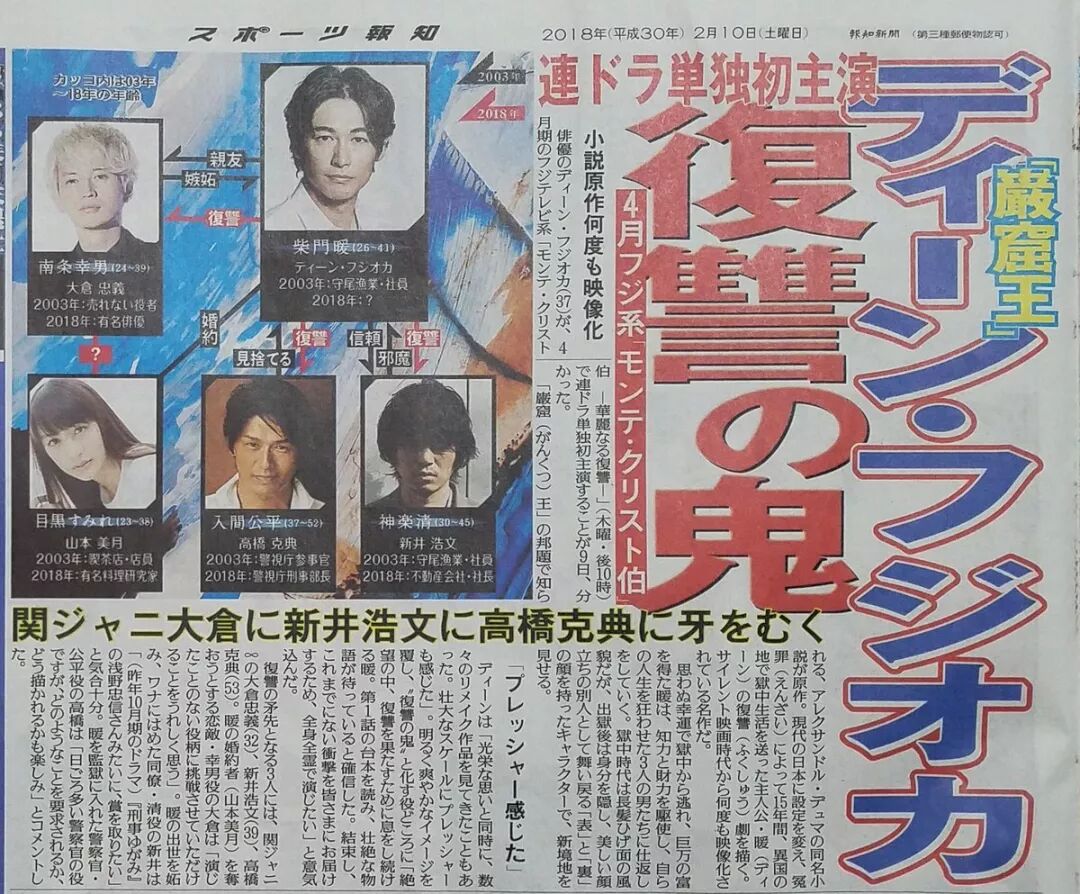 藤冈靛主演,富士4月木10《基督山伯爵-华丽的复仇》根据大仲马的原著小说为基础改编,舞台变成了现代日本,复仇题材,共演大仓忠义、新井浩文、高桥克典、山本美月。