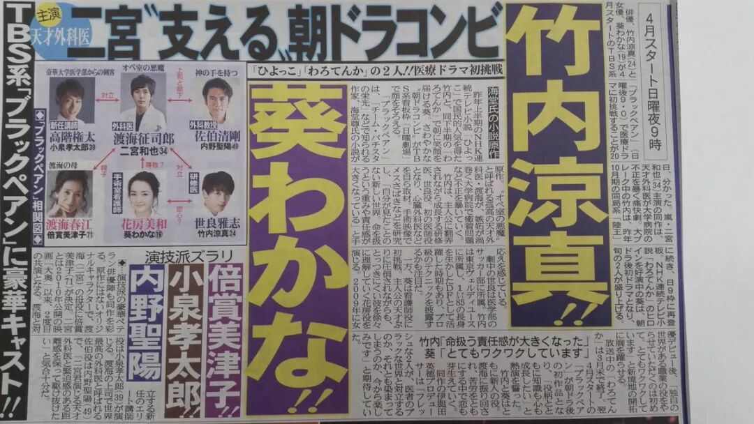 二宮和也主演,TBS日10新剧「ブラックペアン(黑色止血钳)」,改编自海堂尊小说《ブラックペアン1988》。其他共演:葵若菜、竹内凉真、小泉孝太郎 等。