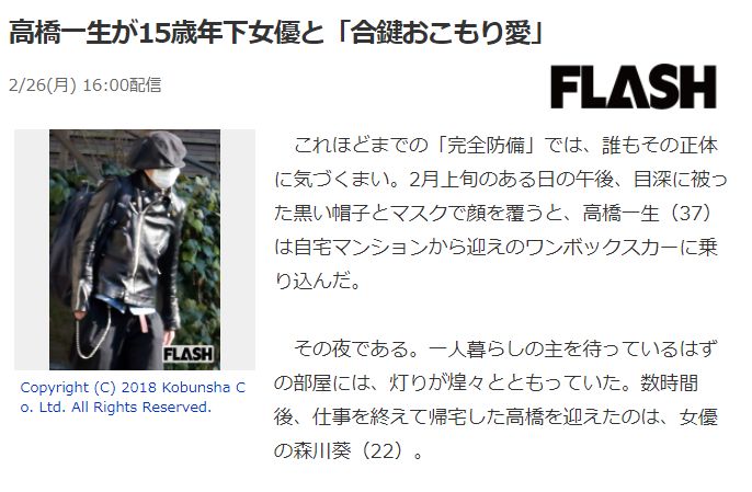《FLASH》杂志多次看见前往高桥一生公寓的森川葵,虽然没有两人共同出入,但是在家中的约会却已经成了固定仪式,而且森川葵拥有高桥一生家的备用钥匙,在他家里等高桥回家也是常有的事。