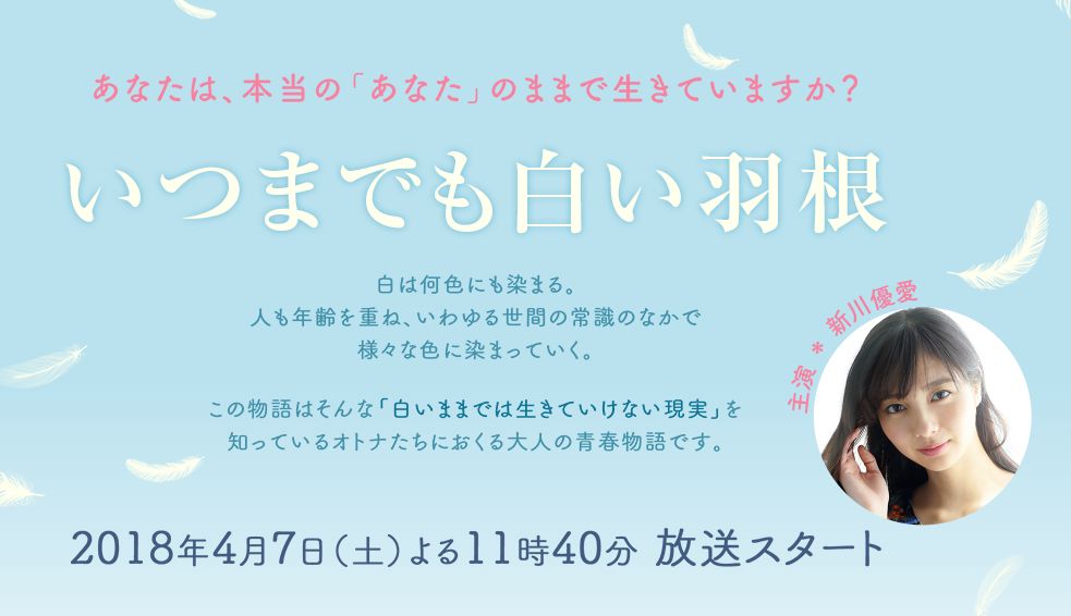 新川优爱主演, 富士土23新剧「いつまでも白い羽根」,其他共演:伊藤沙莉、加藤雅也。讲述的是大学入试失败后考入护士学校的女主,在见习中发生的故事。