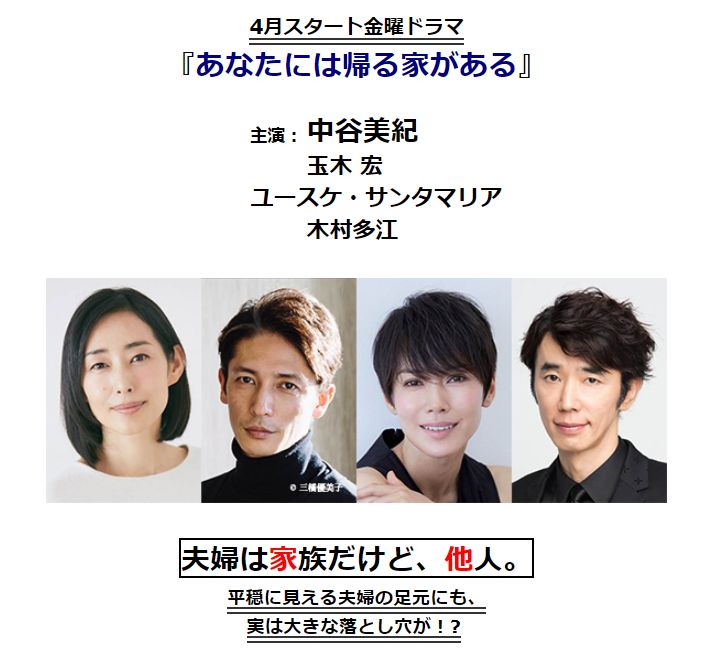 中谷美纪主演,TBS4月金十「あなたには帰る家がある」,直木奖获奖小说家・山本文緒作品改编,讲述能让大多数人产生共鸣的两对夫妻日常中的不满、差别以及幸福的大人群像剧。