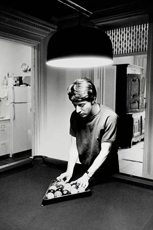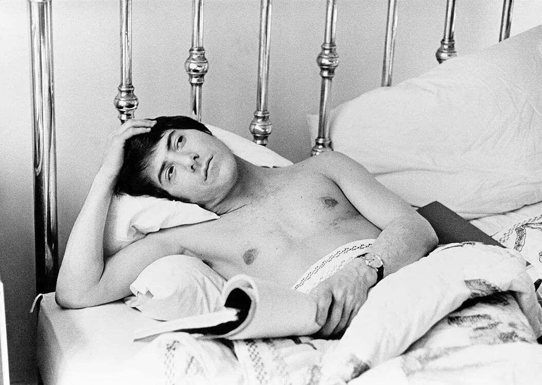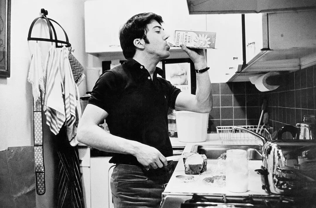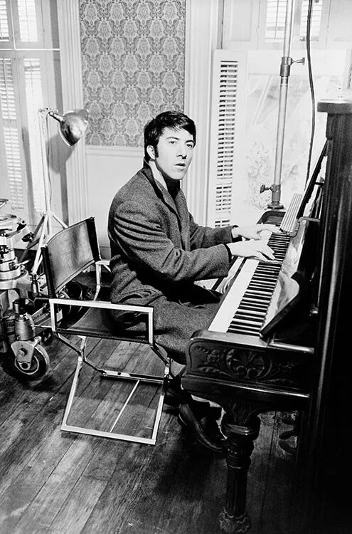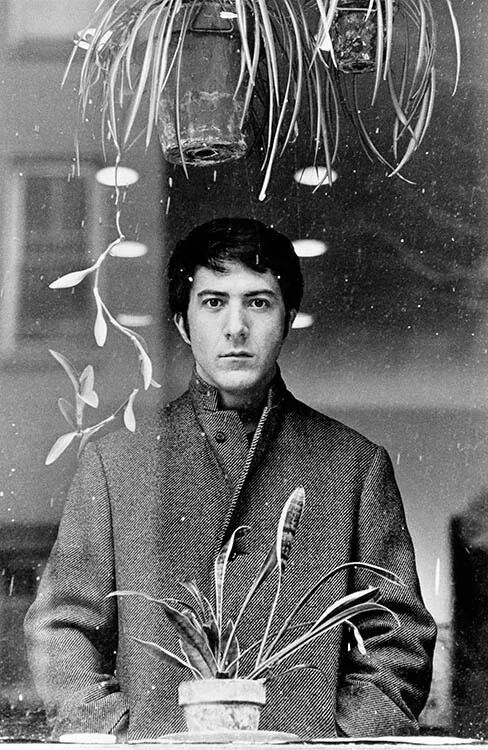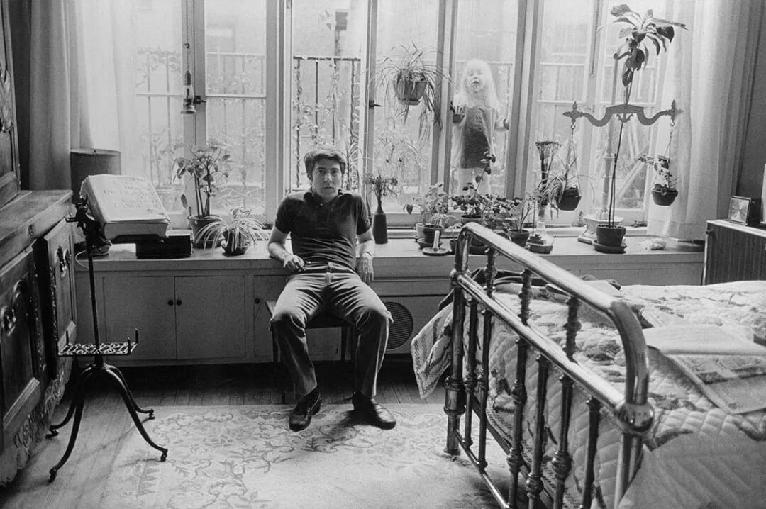 American actor Dustin Hoffman is sitting in a bed room with a little girl behind the window in the background during the filming of ‘John and Mary’ by director Peter Yakes in NYC in 1969.