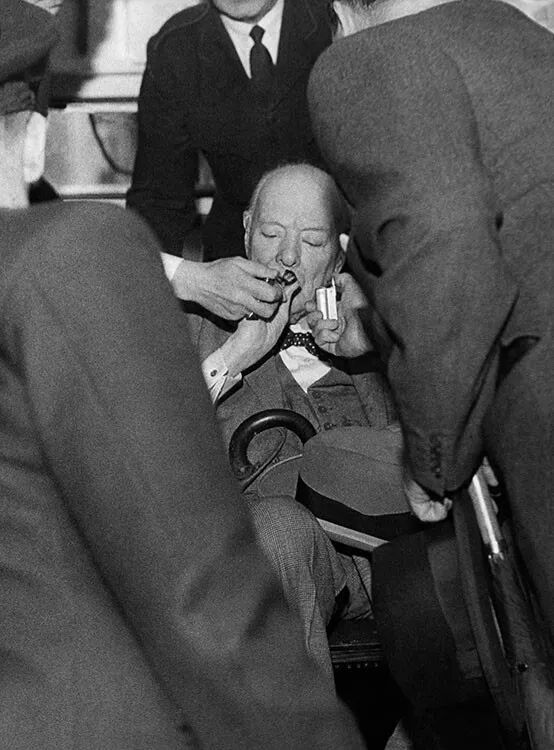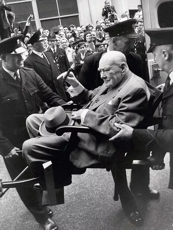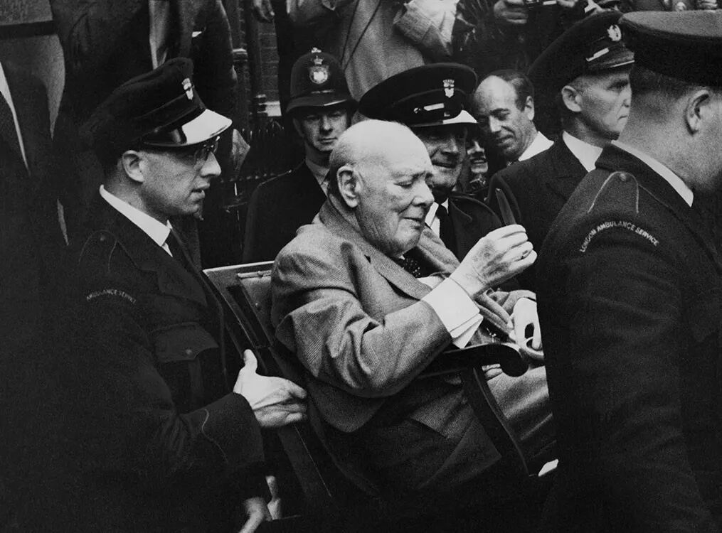 British Prime Minister Winston Churchill (1874 – 1965) is carried in a chair to an ambulance after being discharged from hospital, 21st August 1962.