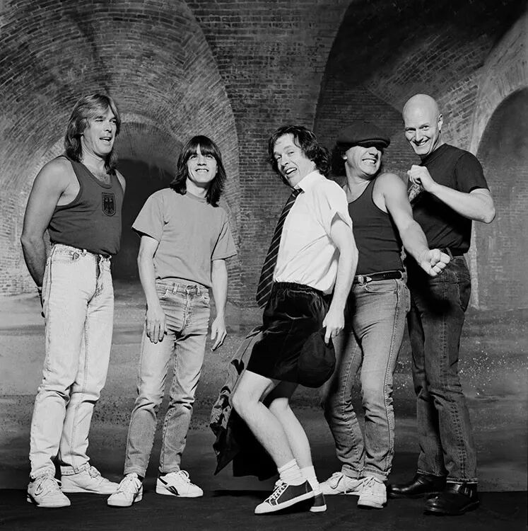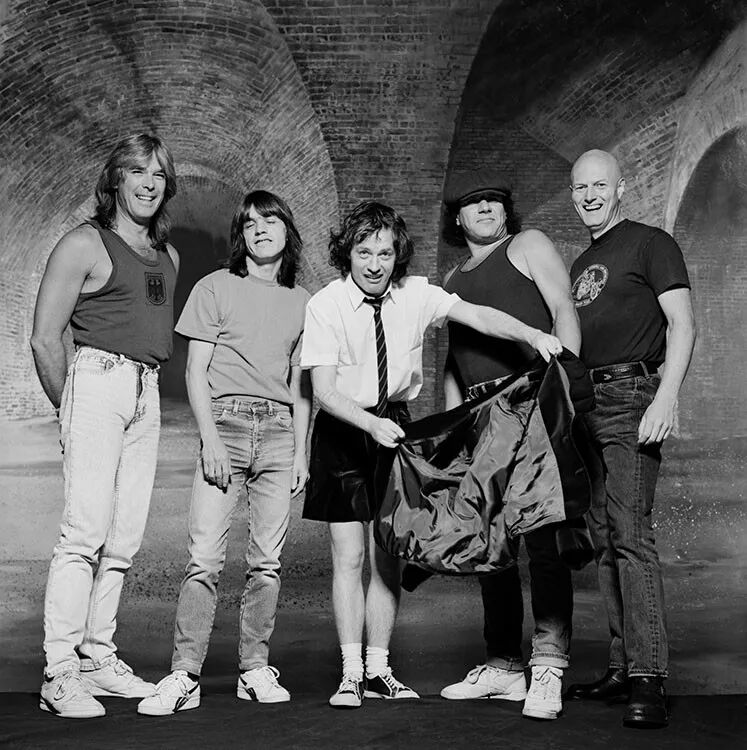 Hard rock group AC/DC shot through glass in London, late 1990s.