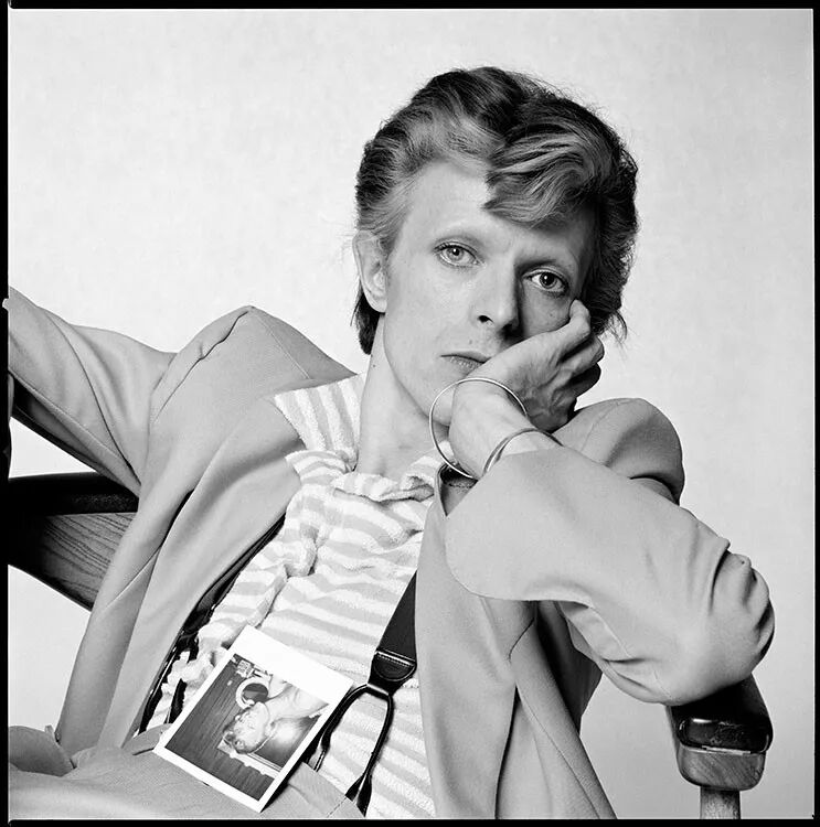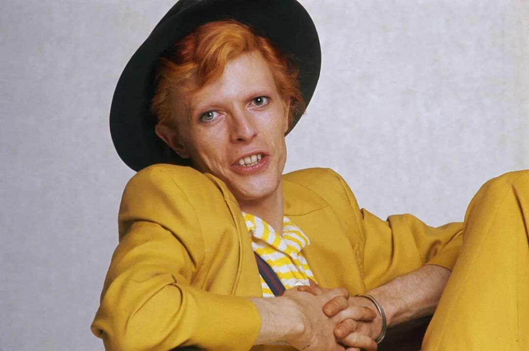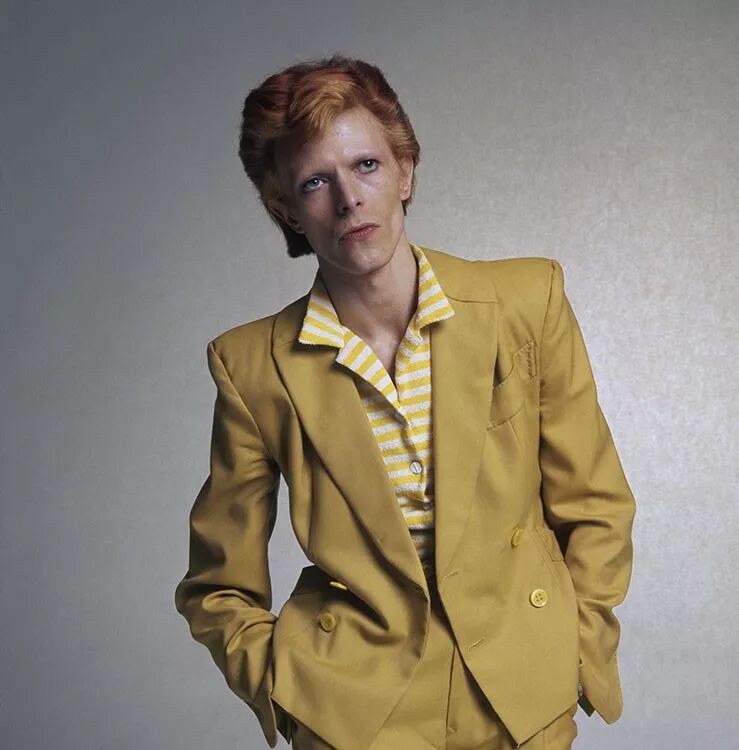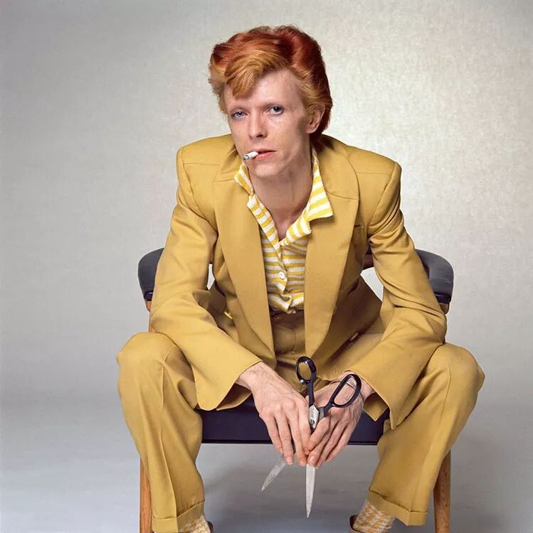 English singer, musician and actor David Bowie with dyed red hair and a mustard yellow suit photographed for a magazine in Los Angeles, circa 1974.