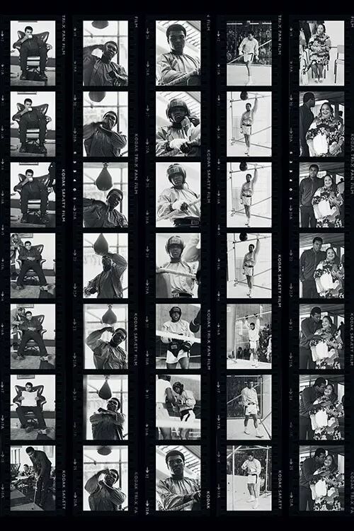 A contact sheet showing various images of boxing champion Muhammad Ali, circa 1975.