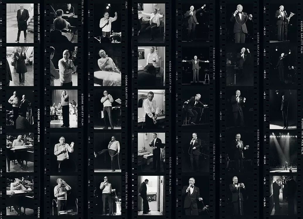 A contact sheet showing various images of American singer and actor Frank Sinatra on a trip to London, circa 1970.