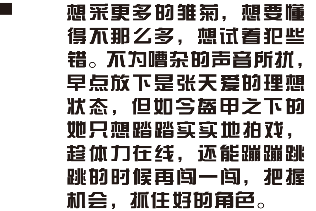 “我好像一直在假装坚强、勇敢。”这是10月3日张天爱的一条微博。她其实挺害怕那些声音的,只能暂时将自己保护起来。如今张天爱只想踏踏实实地拍戏,趁体力在线,还能蹦蹦跳跳的时候再闯一闯,怕过几年身体机能各方面都不行了,接到好角色却拿不下来。“我会试着犯更多的错/我会比这一趟过得傻,很少有什么事情能让我当真/我会到处走走,什么都试试,并且轻装上路/我会采更多的雏菊。”张天爱很喜欢唐·赫罗尔德的这首诗,她希望能早一点学会放下,但也不否认或许就在明年、后年,到了人生的下一个阶段,自己会对这些声音有了新的理解,会全部看开。