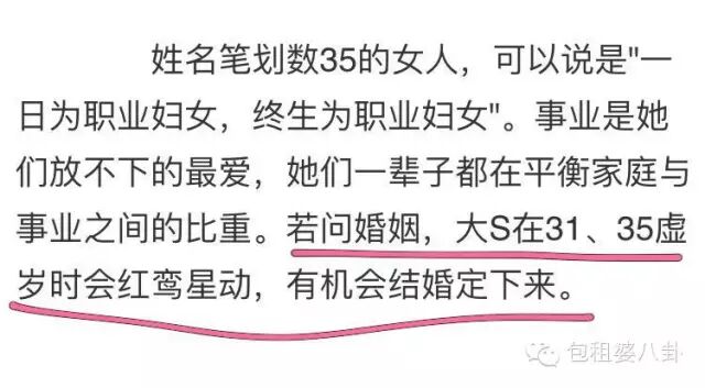 还预言大S会在35岁会红鸾星动。1976年生的大S是在2010年认识汪小菲,刚好是35虚岁。