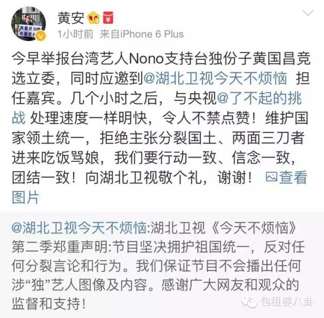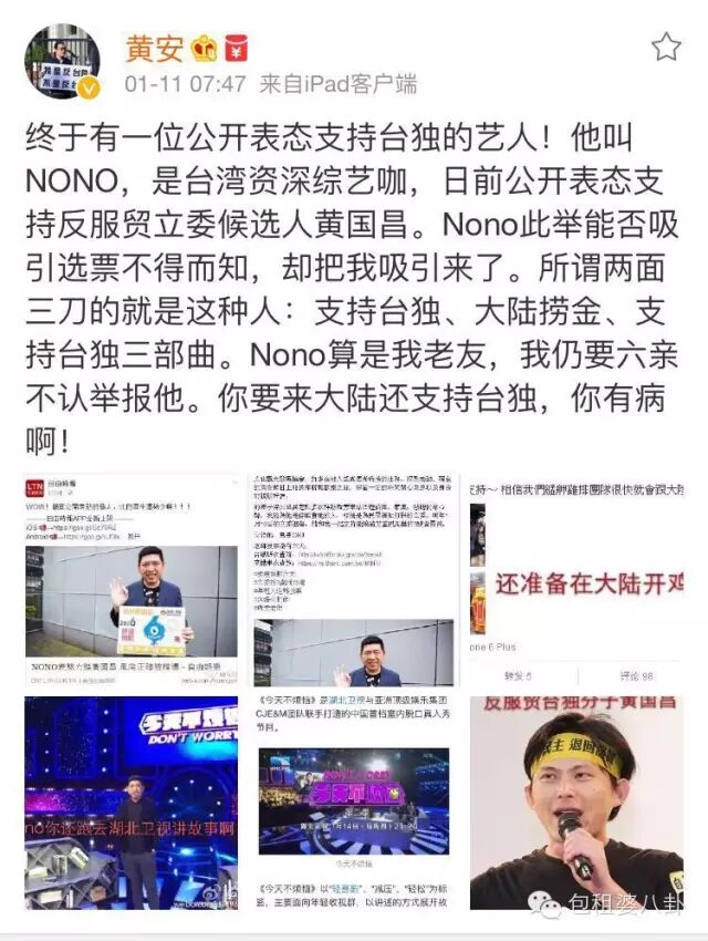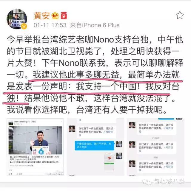 nono原本还想找黄安求求情,结果黄安开出的条件是让nono发一份支持一个中国的声明,nono不敢,黄安直接把这段对话挂在了网上。