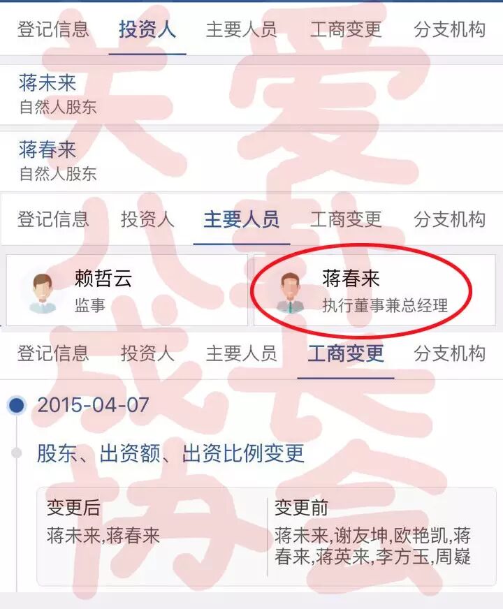 首先是这家是一个房地产开发有限公司,注册资本是wuli韬韬爸爸那家公司的一百倍啊!公司的主要成员除了蒋春来,还有蒋未来、蒋英来,听上去像家族企业啊!