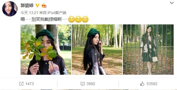 3月11日,郭碧婷在微博秀出一组森系复古风格的美照,笑称:“嗯……别笑我戴绿帽啊……”引来一众网友前来膜拜:“老公,别说话,吻我!”