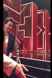 她在观众面前,永远保持情绪最饱满的微笑,言行谈吐端庄优雅丝毫不减,甚至为了表达敬意以及能够更清晰地得到朗读者的回答,甚至“三次下跪”。