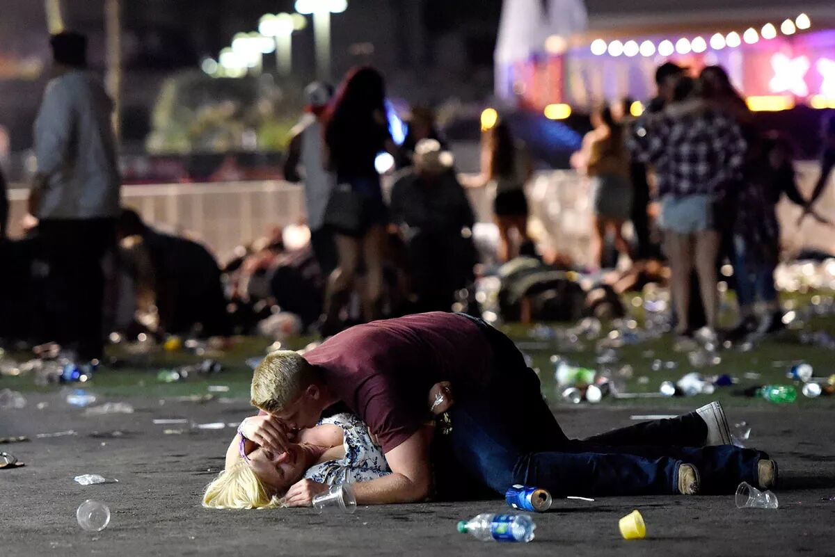 18.2017年10月1日,内华达州拉斯维加斯,在得到一位枪手现场行凶的报告之后,当其他人都逃离“91号公路丰收音乐节”演出场地时,一个男人趴在一个女人的身上。