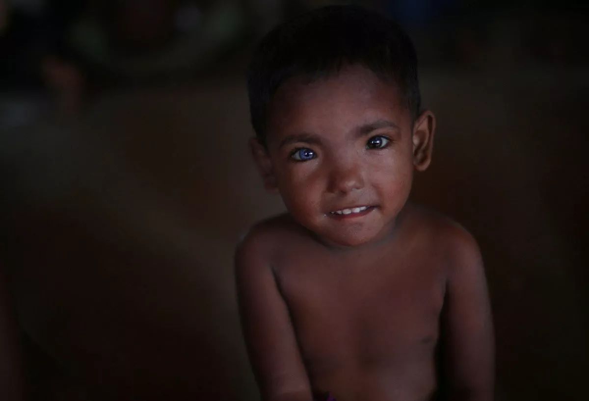 35.2017年11月5日,孟加拉国科克斯巴扎尔附近的 Kutupalong 难民营,两个月前逃离缅甸的4岁的罗兴亚难民 Hosne Ara 在一个儿童中心听孩子们唱歌。