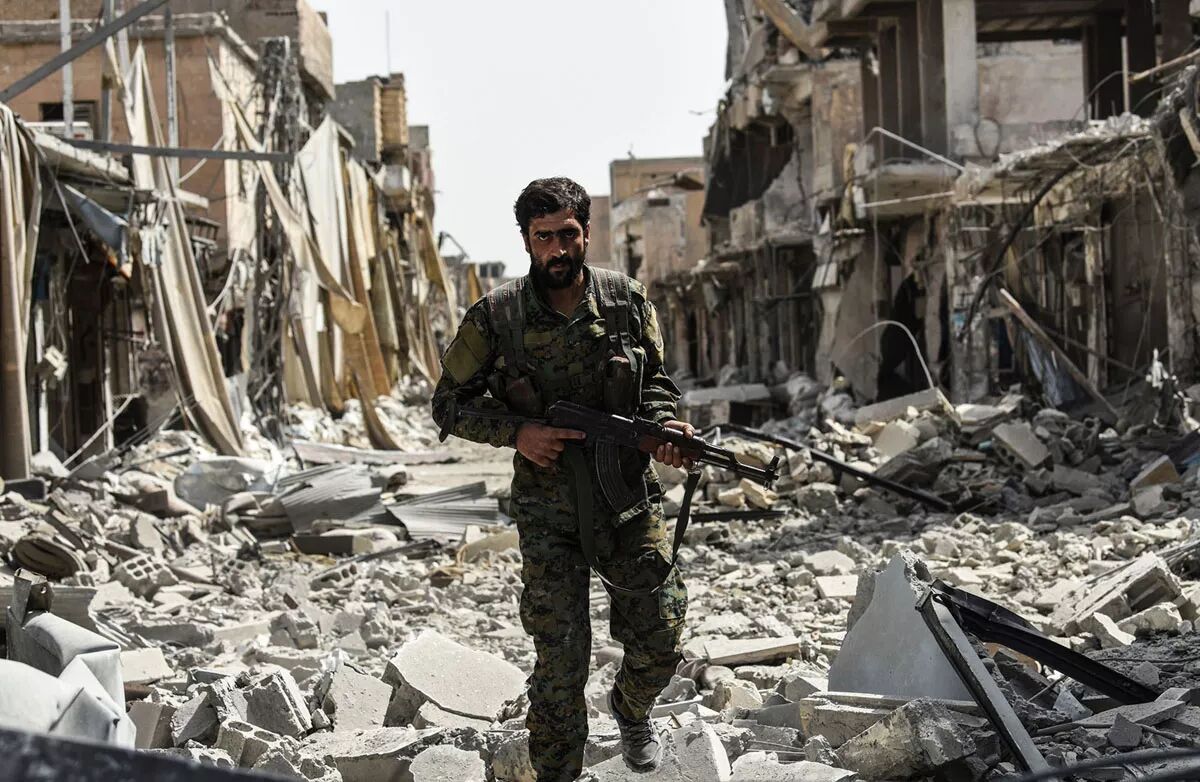 14.2017年9月25日,叙利亚拉卡东部前线,在老城中心,叙利亚民主力量的一位成员从瓦砾残骸中走过。