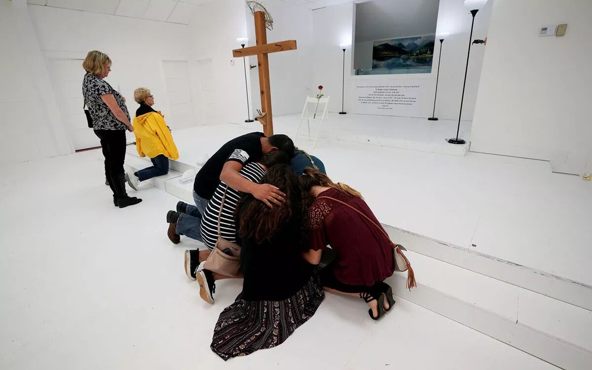 36.人们在得克萨斯州 Sutherland Springs 的第一浸信会教堂祈祷,一周前,有26人在那里的一次枪击事件中被杀。2017年11月12日,教堂向公众开放,纪念那些被杀的人。