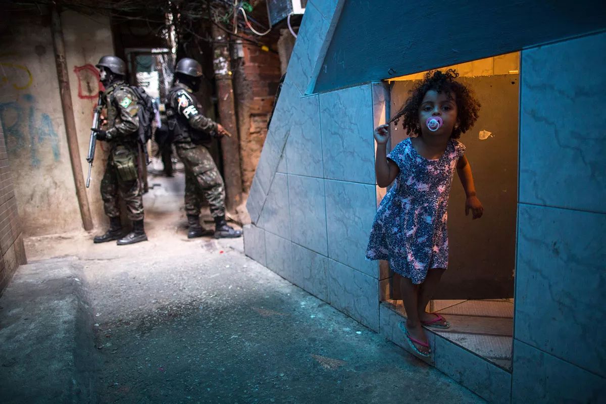 16.2017年9月25日,巴西里约热内卢市 Rocinha 棚户区,巴西军事警察在一条小巷里巡逻。