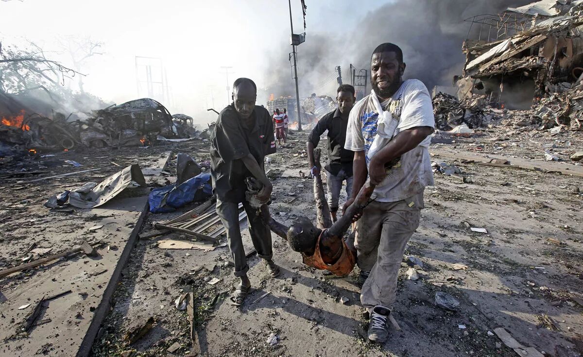 21.2017年10月4日,索马里首都摩加迪沙,索马里人在搬走一个在爆炸中丧生的人的尸体。