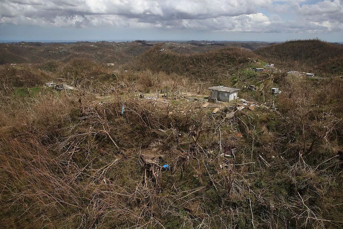 12.2017年9月25日,波多黎各,飓风玛丽亚过后,科罗萨尔附近的山顶上,到处都是损毁的家园,被刮倒的树木,以及被剥光了树叶的树木。