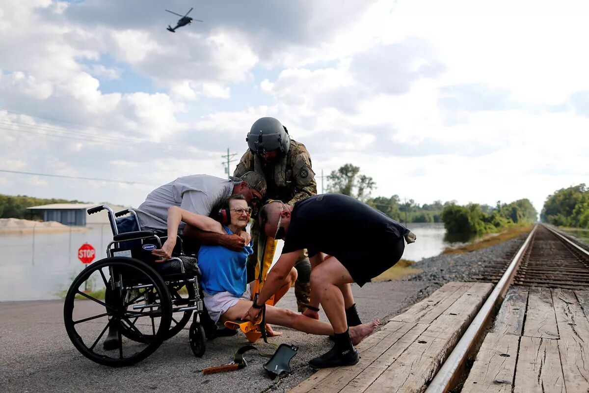 02.2017年8月31日,得克萨斯州罗斯城,飓风哈维带来的洪水淹没 Hersey Kirk 的家,救援人员帮助她进入一个限制活动自由的装置,而救援直升机在把她从家中救出之后悬停在远处。