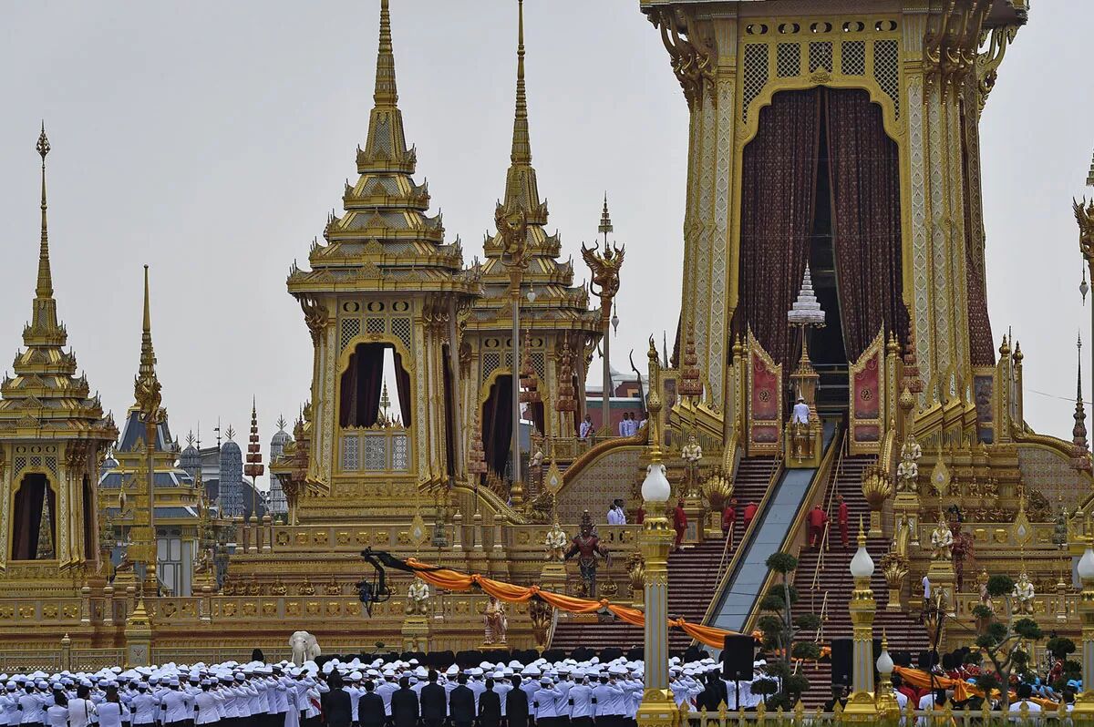 28.2017年10月26日,泰国曼谷,已故泰国国王普密蓬·阿杜德的葬礼期间,他的骨灰瓮沿着一条斜坡被运进王家火葬场,官员们在一旁注视着。