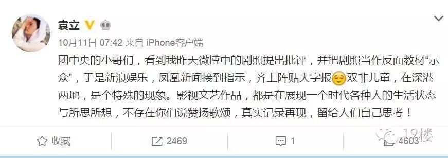 对此,袁立在微博回应称,这些照片只是剧照,“影视文艺作品,都是在展现一个时代各种人的生活状态与所思所想,不存在你们说赞扬歌颂,真实记录再现,留给人们自己思考!”并表示:“(@12360海关热线 )不职业不严谨不公正!”