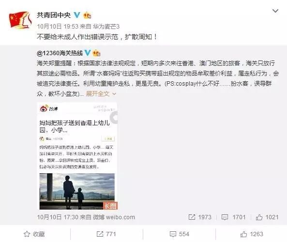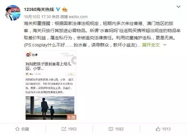 这条微博吸引了中国海关总署的注意。当天傍晚,海关总署的官方微博@12360海关热线 发出博文:根据国家法律法规规定,短期内多次来往香港、澳门地区的旅客,海关只放行其旅途必需物品。所谓“水客妈妈”往返购买携带超出规定的物品牟取差价利益,属走私行为,会被追究法律责任。利用幼童掩护走私,更是无良。(PS:cosplay什么不好……扮水客,误导群众,教坏小盆友)