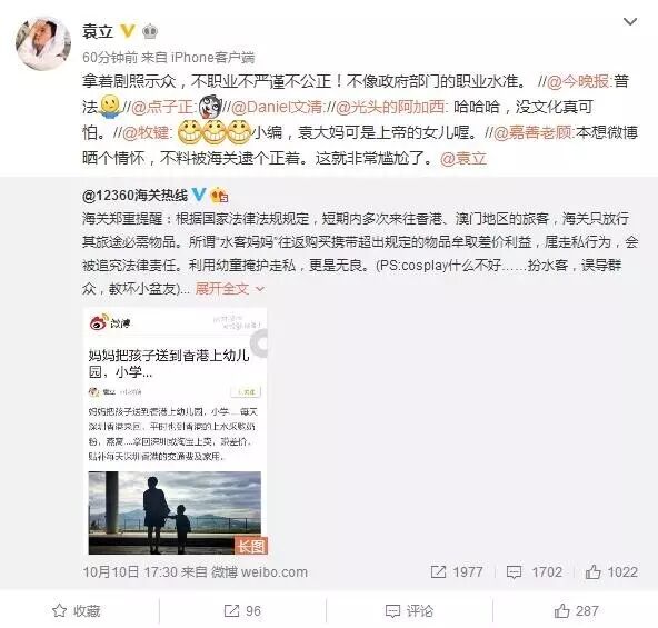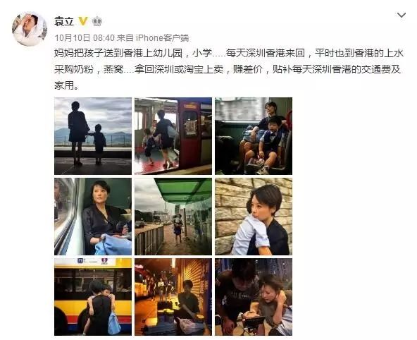 10月10日,微博大V、演员袁立在其个人微博上发了一组照片,并配文说:妈妈把孩子送到香港上幼儿园,小学.....每天深圳香港来回,平时也到香港的上水釆购奶粉,燕窝....拿回深圳或淘宝上卖,赚差价,贴补每天深圳香港的交通费及家用。