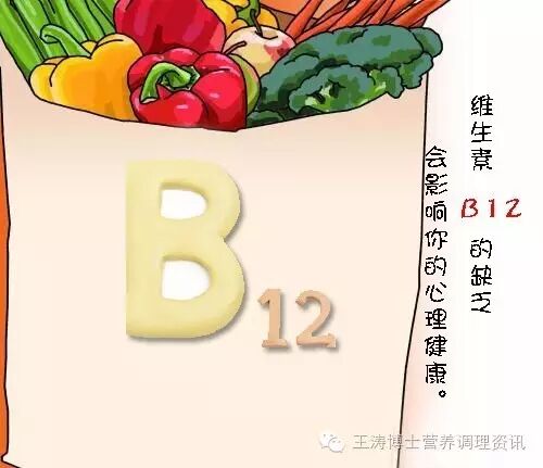维生素B12的缺乏会影响你的心理健康。有研究表明,患有严重抑郁的老年妇女中,超过1/4的人B12不足。维生素B12主要存在于动物性食物(肉、鱼、家禽、蛋、奶)和贝类(如蚌、蟹)中,大多数成年人每日需要消耗2.4微克维生素B12。