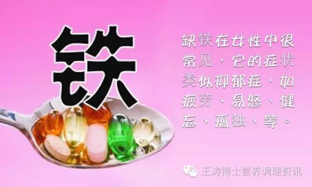 缺铁在女性中很常见,大约20%的妇女和50%的孕妇都有这种情况,而男性中只有3%。贫血中最常见的红血细胞数量不足也是由缺铁引起的,它的症状类似抑郁症,如疲劳、易怒、脑雾(健忘、孤独、不合群)等。美国国立卫生研究院推荐,大多数成年人每天应该摄入18毫克的铁。铁的来源包括肉、鱼、家禽等。