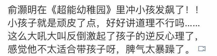 然而结合俞灏明这次的“发飙”事件来看,wuli俞老师的脾气有时候确实火爆了一些,有的时候甚至还会因为高分贝而吓到孩子,小孩子难免都有顽皮的天性,希望我们都能给予他们更多的耐心。