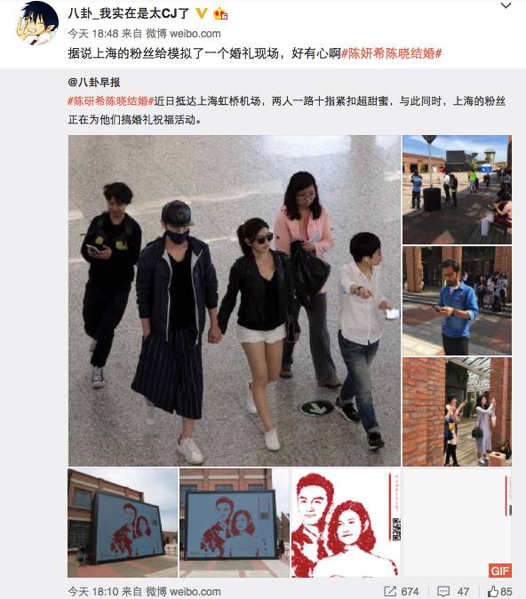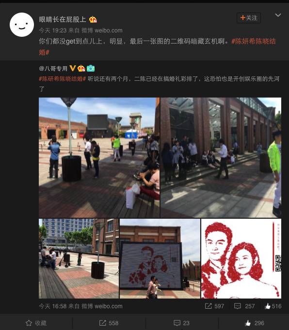 1,紧凑的时效性:「双陈」今早发布大婚日期,基本上下午就开始做借势传播了,而且整套借势是持续性的,前几天的各种资源曝光算是很好的预热,今天是集中发力;