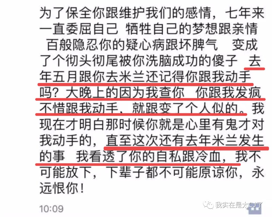 5.七年来陈昱霖一直委曲求全,但因为去年5月和吴秀波去米兰期间查岗被打,以及“这次米兰发生的事”,让她“看透了”吴秀波的“自私和冷血”。