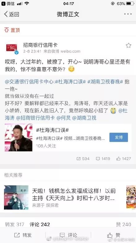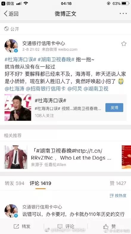 杜海涛:居然把晚会最大赞助商给念错了, 将“交通银行”念成“招商银行”,吓坏了一旁的何炅跟梁田,两人脸登时绿了。 还念成了竞争对手的??你说这是不是完了。心疼海涛年终奖没了。带你们还原一下现场。
