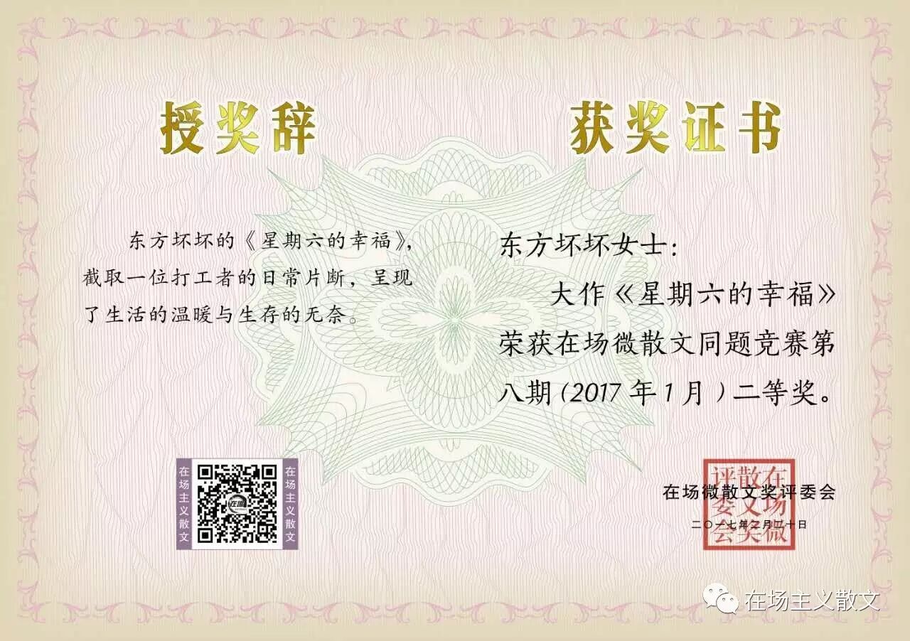 授奖辞:东方坏坏的《星期六的幸福》,截取一位打工者的日常片断,呈现了生活的温暖与生存的无奈。