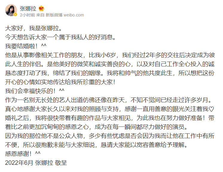 6月3日,@张娜拉在微博发文宣布结婚喜讯!