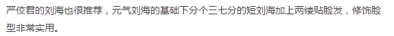 元气刘海就很适合,适当在脸颊两边留出点头发做个S卷更能修饰脸型。